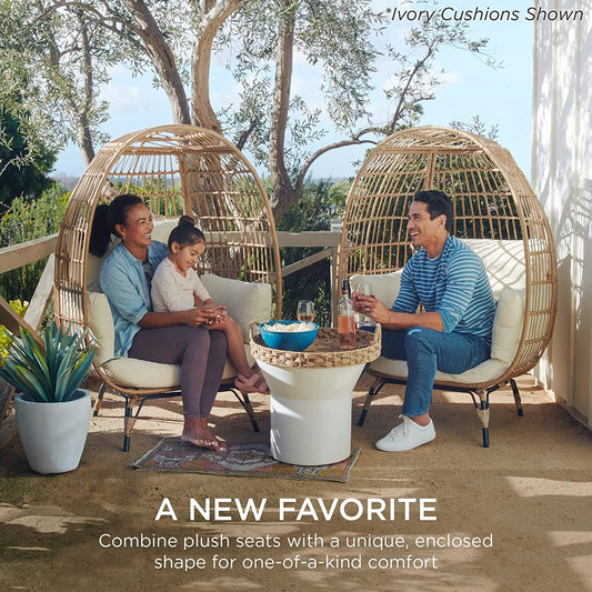 Cordelia Hanging Egg Chair with Steel Stand Set - Resin Wicker Porch Swing - Includes Beige Cushion and Headrest